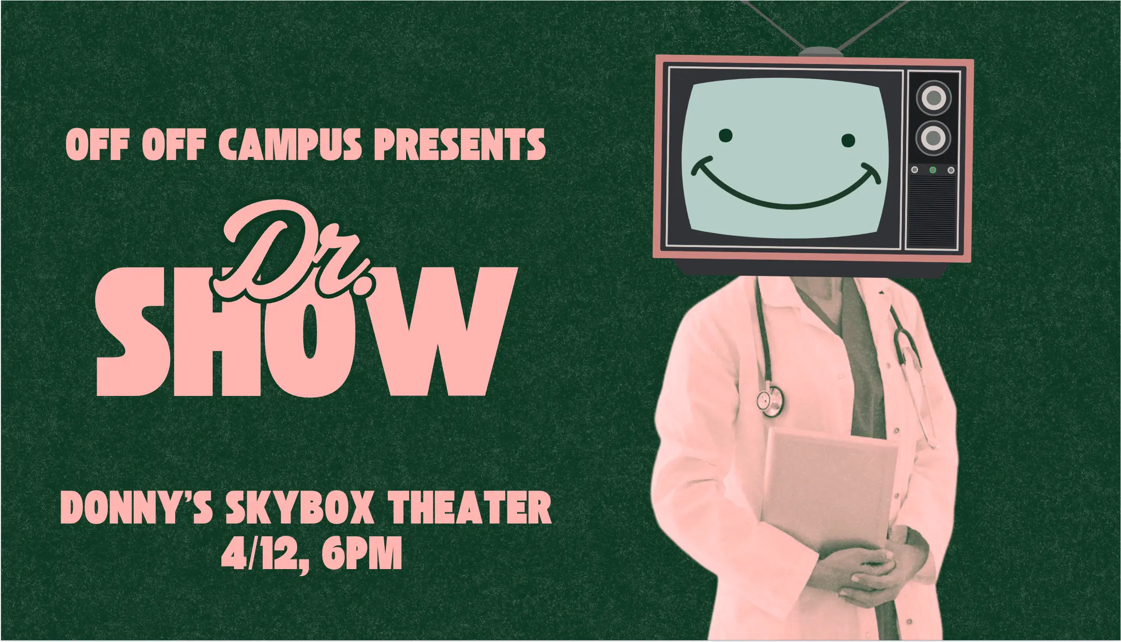 Dr. Show guarantees you a one-night fix-up. They say laughter is the best medicine so we’re gonna shove it down your throats. Select members of Off-Off Campus from the University of Chicago bring you a variety of sketches. Every sketch is set up to be a suggestion for the next. Think of a really long and scripted game of telephone. brrring brrring, Dr. Show’s office, how can we help you?