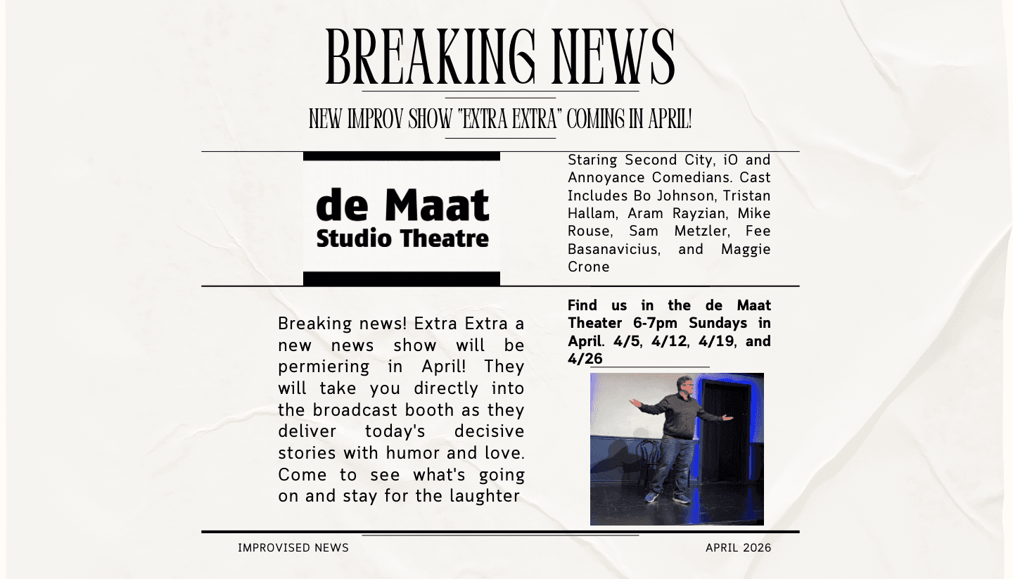Improvised news room. Come join the cast of Extra Extra as we twist today’s headlines and make you laugh at today’s greatest stories through the lens of a news room, interviews, and scenes inspired by everything!