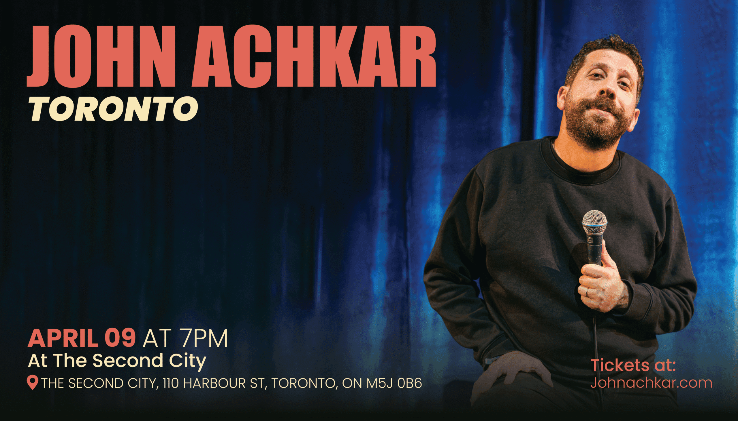 John Achkar is announcing his new one hour soon and he wants to do his final testing show in Toronto.